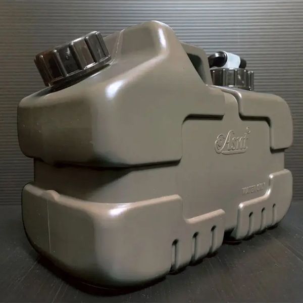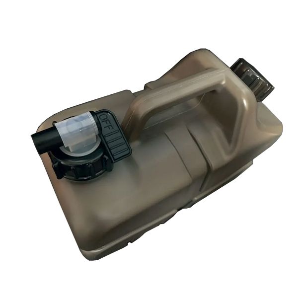 〇ミリタリーカラーがアウトドアに馴染む、持ち運びやすい5リットルの飲料水用タンクです。