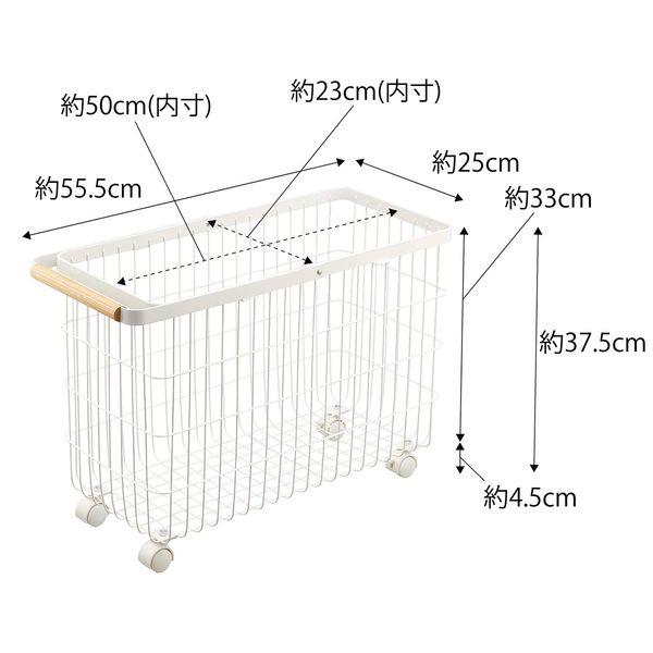 サイズ | 商品サイズ(約):W55.5×D25×H37.5cm (ハンドル使用時:約H66cm) 内寸サイズ 開口部:約W50×D23cm 床からバスケットの高さ:約4.5cm 容量(約):35L 商品重量(約):1950g 耐荷重(約):5kg 付属品:スパナ 組立式 |