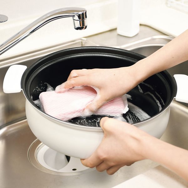 | 素材 | 表面加工 内面:ふっ素樹脂塗膜加工 ホワイト外面:焼付け塗装 本体:アルミニウム合金 はり底:ステンレス鋼(クロム16%) ハンドルカバー:シリコーンゴム(耐熱温度200℃) 蓋:アルミニウム合金 つまみ:フェノール樹脂(耐熱温度150℃) |