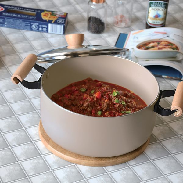| 素材 | 表面加工/ 内面:ふっ素樹脂塗膜加工 外面:焼付け塗装 本体:アルミニウム合金 はり底:ステンレス鋼(クロム16%) 取っ手:天然木 蓋 品名/強化ガラス製器具 強化の種類/全面物理強化 縁リング:ステンレス鋼 つまみ:天然木 |