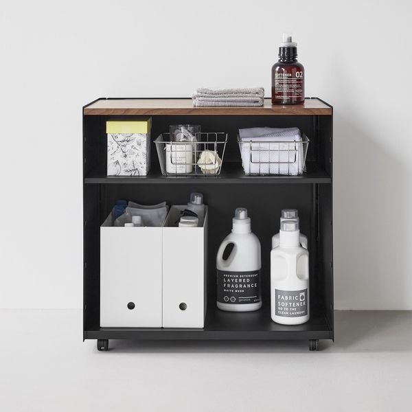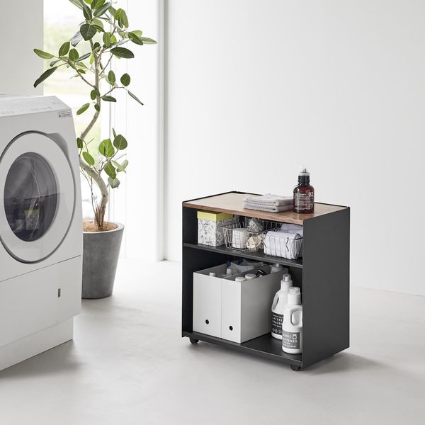 〇シンプルでスタイリッシュなデザインなので、キッチン収納や洗濯用品の収納にと、様々な場所やシーンで活躍できるマルチなワゴンです。