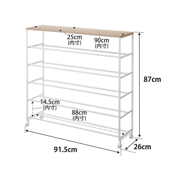 サイズ | 商品サイズ:W91.5×D26×H87cm(キャスター含む) 内寸サイズ 天板:W90×D25cm 1段あたり:W88×H14.5cm 対応サイズ 収納可能数 シューズ・ブーツ:20足(大人用) ヒール・サンダル:25足(大人用) ※サイズや形状により異なります。 商品重量:7200g 耐荷重 天板:2kg 1段あたり:3kg フック1つあたり:500g (静止荷重) 付属品 スパナ フック×2 組立式 |
