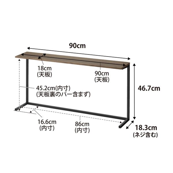 | サイズ | 商品サイズ:W90×D18.3(ネジ含む)×H46.7cm 内寸サイズ 天板:W90×D18cm 天板下:W86×D16.6×H45.2(バー含まず)cm 商品重量:3750g 耐荷重:7kg 付属品:六角レンチ 組立式 |