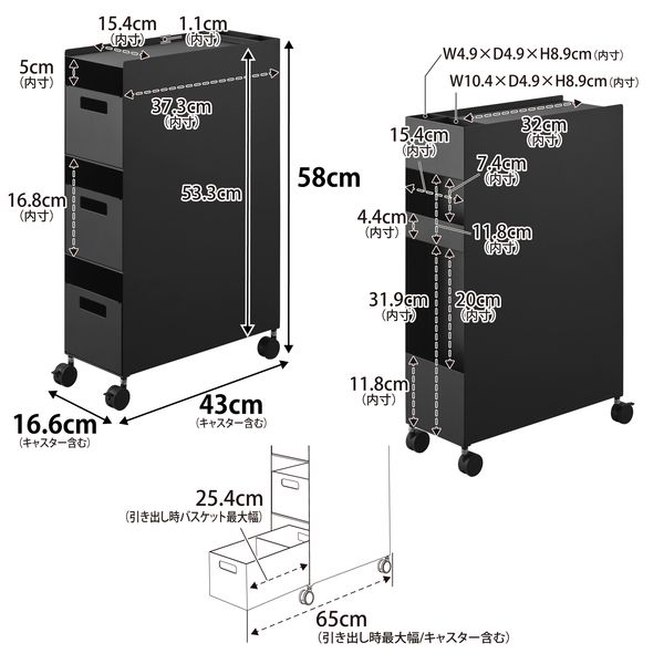 | サイズ | 商品サイズ 本体:W16.6×D43×H58cm バスケット:W15.3×D32.1×H12.2cm(1つあたり) 内寸サイズ バスケット1つあたり:W14.5×D31.5×H11.5cm(仕切り板含まず) 商品重量:7000g 耐荷重 天板:4kg バスケット1つあたり:4kg 背面収納部1段あたり:1kg (静止荷重) 付属品:スパナ |