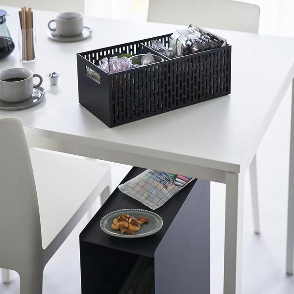 〇バスケットは取っ手付きで前後に出し入れしやすく、可動式の仕切り板を使えば、収納したい物に合わせて収納することができます。