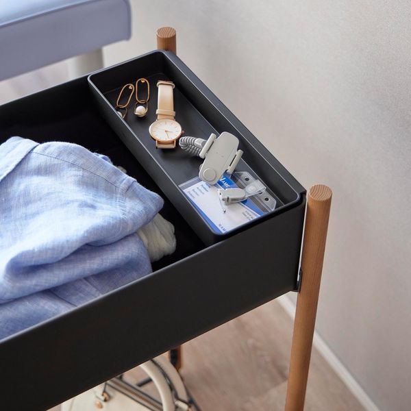 〇アクセサリーや貴重品を置くのに便利な小物トレーは、バスケットのフチに引っ掛けてセット。お好みの位置に取り付けられます。