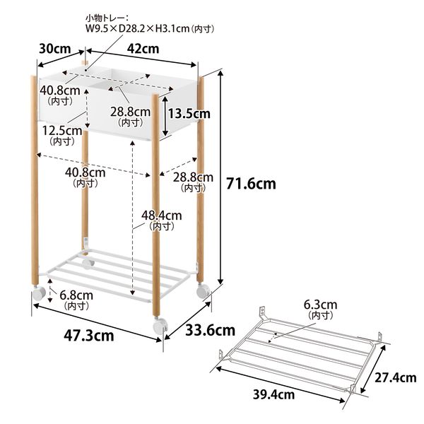 | 素材 | 棚:スチール(粉体塗装) 支柱:天然木(ウレタン樹脂塗装) バスケット・小物トレー:ABS樹脂 キャスター:ナイロン |