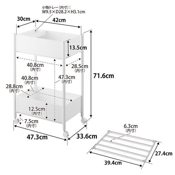 素材 | 棚・支柱:スチール(粉体塗装) バスケット・小物トレー:ABS樹脂 キャスター:ナイロン |