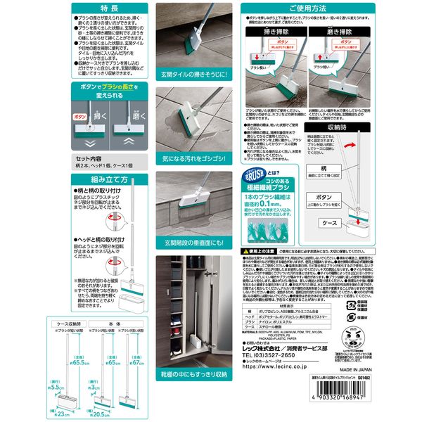 〇1本2役!ブラシの長さを変えることで玄関の掃き掃除とタイル・目地の磨き掃除ができます。