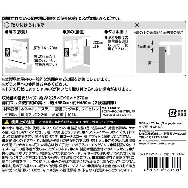 | 素材 | 本体:ポリエステル フック:ポリプロピレン |