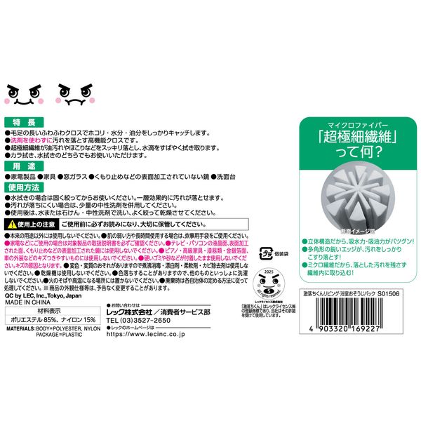 | 注意事項 | ※水拭きの場合は固く絞ってからお使いください。一層効果的に汚れが落とせます。 ※汚れが落ちにくい場合は、少量の中性洗剤を併用してください。 ※使用後は、水または石けん・中性洗剤で洗い、よく絞って乾燥させてください。 |