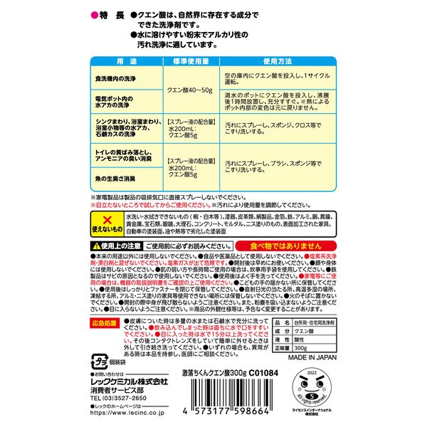 〇「食洗機内の洗浄」・「電気ポット内部の洗浄」・「シンクまわり、浴室周り、浴室小物等の水アカ、石鹸カスの洗浄」・「トイレの黄ばみ落とし、アンモニア臭の消臭」・「魚の生臭さ消臭」など