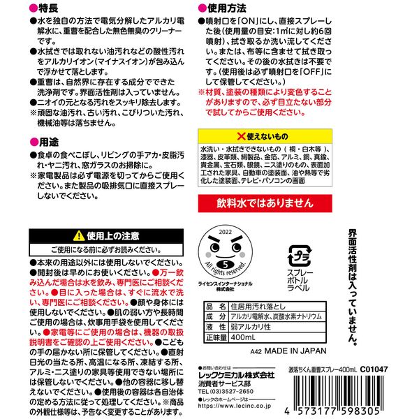 〇独自の方法で水を電気分解した、激落ちくんのアルカリ電解水に「重曹」を配合した、ナチュラルな無色無臭のクリーナーです。